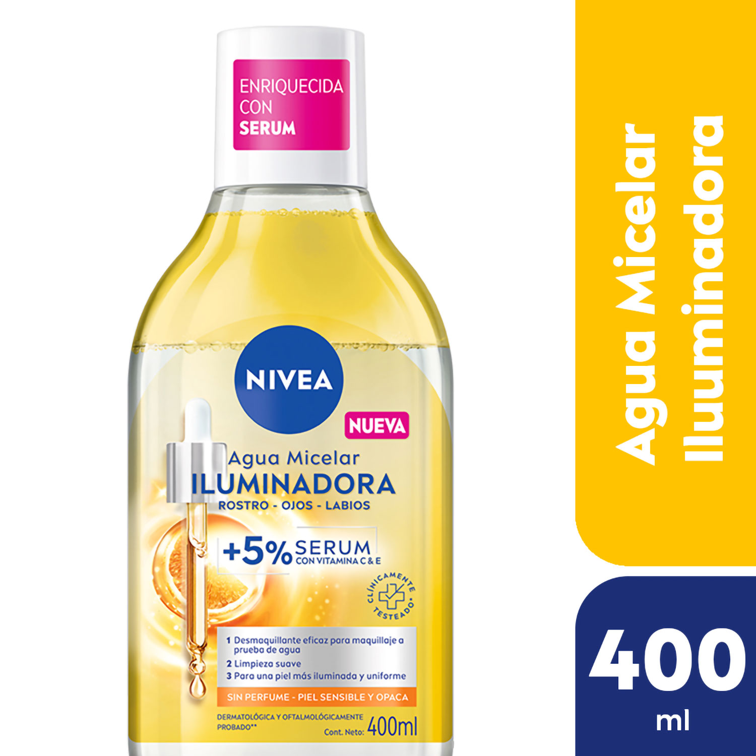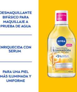 2) Aplicar NIVEA Agua Micelar Iluminadora suavemente por tu cara y ojos cerrados para disolver el maquillaje